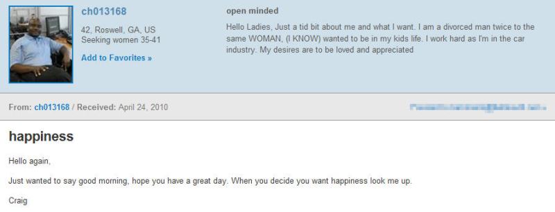 This particular online dating site offers a couple of options to communicate your interest in, and to, prospective dates. You can “wink“, email, instant message, or ask for a phone number. Also, there is a wonderful feature that allows you to see who has viewed your public profile. I like this feature and I use it often and I am certain I am not alone in my sentiment. After trolling a couple of profiles, which included his, I get this message from “Craig” on April 22nd. (click the image for a larger view)