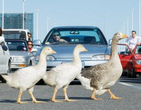 I look out my rear view mirror and there are about 5 geese chasing my car! Apparently I had hit one of their compadres.